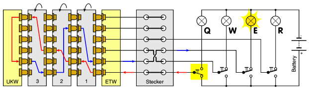 Enigma is an electromechanical machine with electrical signals and mechanical parts that actually move, rotate, etc. Enigma’s keyboard is similar to a computer keyboard: when pressing a key, a contact plugs the power source to the electrical circuit. This produces a current that travels through the entire machine.