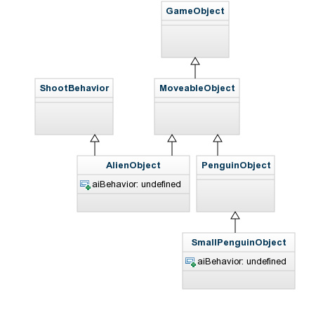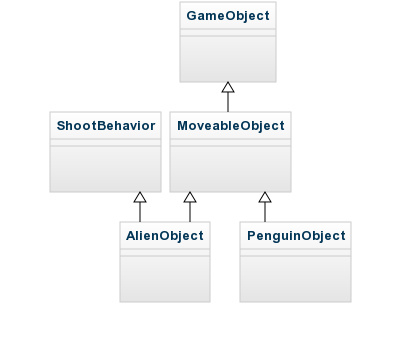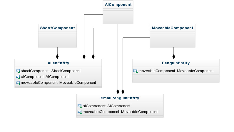 In order to achieve the behavior I want, all that is needed is to create the MoveableComponent, ShootComponent, and AIComponent classes, instantiating them to the objects I want to. In this example, all objects have the a MoveableComponent instance. AlienObject would also have the ShootComponent and AIComponent instances, and SmallPenguinObject has a AIComponent instance.